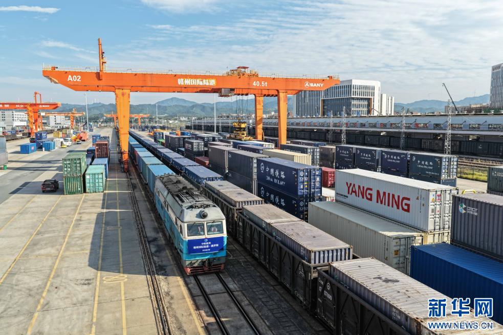11月19日,一列貨物列車緩緩駛出贛州國際陸港。新華社發(fā)(鄒陽攝)